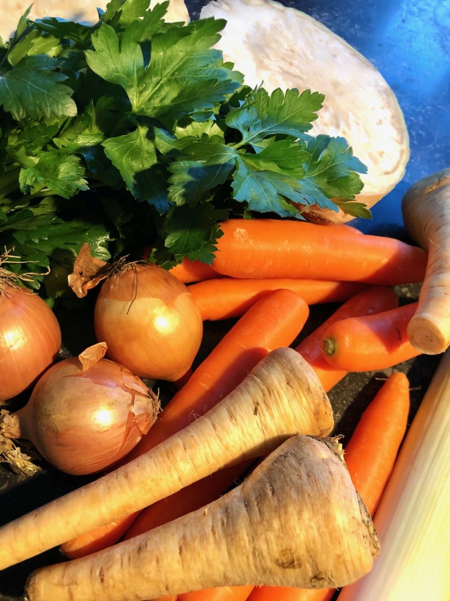 - Das Wurzelwerk in dem Bratrückstand anbraten.