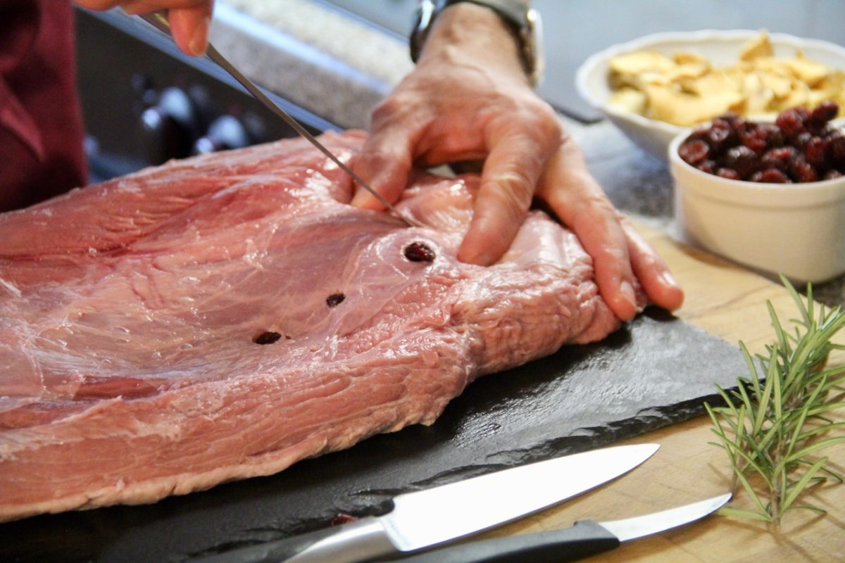 - Mit einem spitzen, scharfen Messer Löcher in die Innenseite des Kalbshalses stechen und mit den Cranberries spicken. Dann die Löcher mit den getrockneten Apfelspalten belegen.
