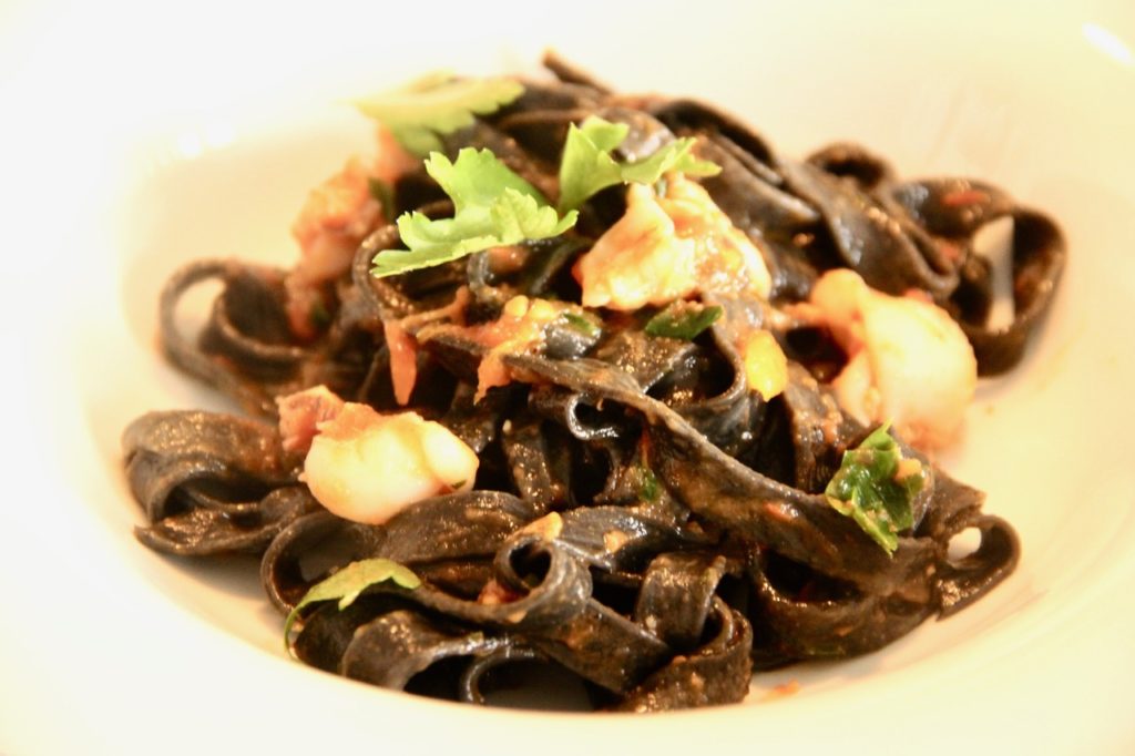 Vor sehr vielen Jahren hat sich Wirtshausführer-Herausgeber Klaus Egle von seiner Mutter eine Nudelmaschine gewünscht. Er bekam sie geschenkt mit den Worten „Die wirst du zwei Mal verwenden und dann…“. Mit dem Rezept von Ivo Surlina-Poropat vom Wiener Restaurant SOPILE, einem Meister der mediterranen Küche, wurden es jetzt drei Mal und: Das gute Stück funktioniert nach wie vor tadellos! Produziert wurden dadurch Sepia-Nudeln, eingefärbt mit Sepia-Tinte, die den Nudeln überdies einen besonders maritimen Geruch und Geschmack verleihen. Dazu ein paar scharf angebratene Calamari und gut eingekochte Tomaten – und schon meinten wir, das Meer an den Gestaden von Wien-Gumpendorf rauschen zu hören! Und Übrigens: Bei Ivo Surlina werden die Nudeln täglich frisch gemacht…