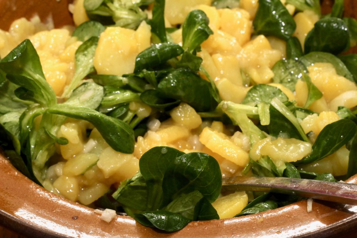 Zu einem urtypisch wienerischen Gericht, so finde ich, sollte man auch einen typischen Wiener Wein trinken. Das mag zwar kein besonders wissenschaftlicher, aber, wie sich herausstellen sollte, durchaus genussbringender Ansatz sein. Riesling käme dafür in Frage, auch Weißburgunder aber ich habe mich nach einer kurzen Vorverkostung für den wohl traditionsreichsten Wein der Stadt entschieden: Einen Wiener Gemischten Satz vom Weingut Walter Wien. Der Wiener Gemischte Satz alte Reben vom Hackenberg, Alte Reben, schien mir die nötige Reife zu haben (nicht zu alt, nicht zu jung), außerdem genügend Säure um das Ganze ein wenig aufzulockern aber auch die nötige Power um in diesem Duett nicht sang- und klanglos unterzugehen. Eine Annahme, die sich bestätigte, der Wein zeigte zarte Reifenoten im Duft, war kraftvoll aber doch auch mit einem schönen Trinkfluss ausgestattet und ergab in Kombination mit dem Schnitzel eine perfekte Wiener Melange.