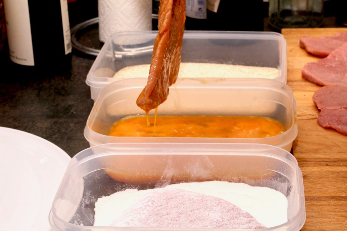 Die Fleischstücke sanft mit der glatten Seite des Fleischklopfers ausklopfen und auf beiden Seiten salzen. Die Schnitzel zuerst in Mehl wenden, anschließend durch das leicht verschlagene Ei ziehen und mit Semmelbrösel panieren. Die Brösel dabei nicht zu fest an das Fleisch drücken.