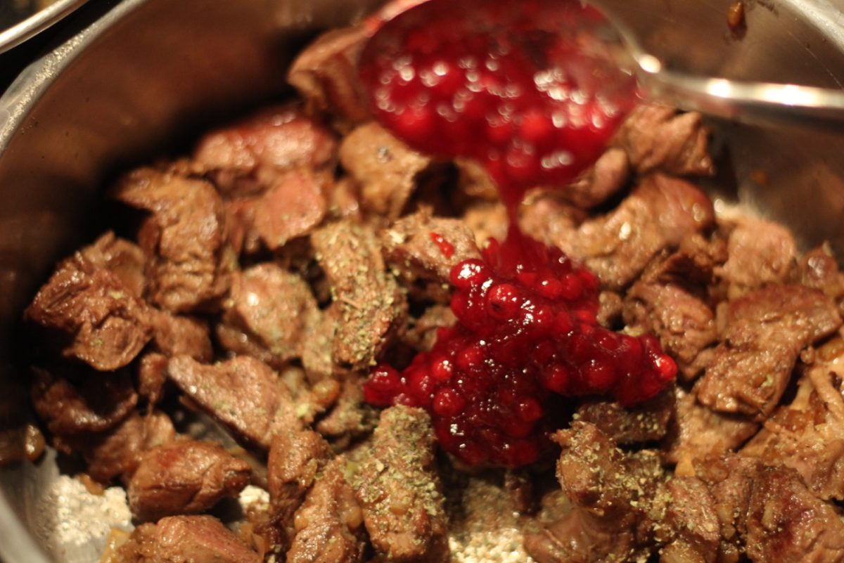 Zum Binden des Ragouts, Mehl mit wenig kaltem Wasser (3-4 EL) verrühren und bis zur gewünschten Konsistenz in das Ragout einrühren, kurz aufkochen. Preiselbeeren, Maroni, Pilze und Obers hinzufügen, durchmengen und eventuell nachwürzen.
