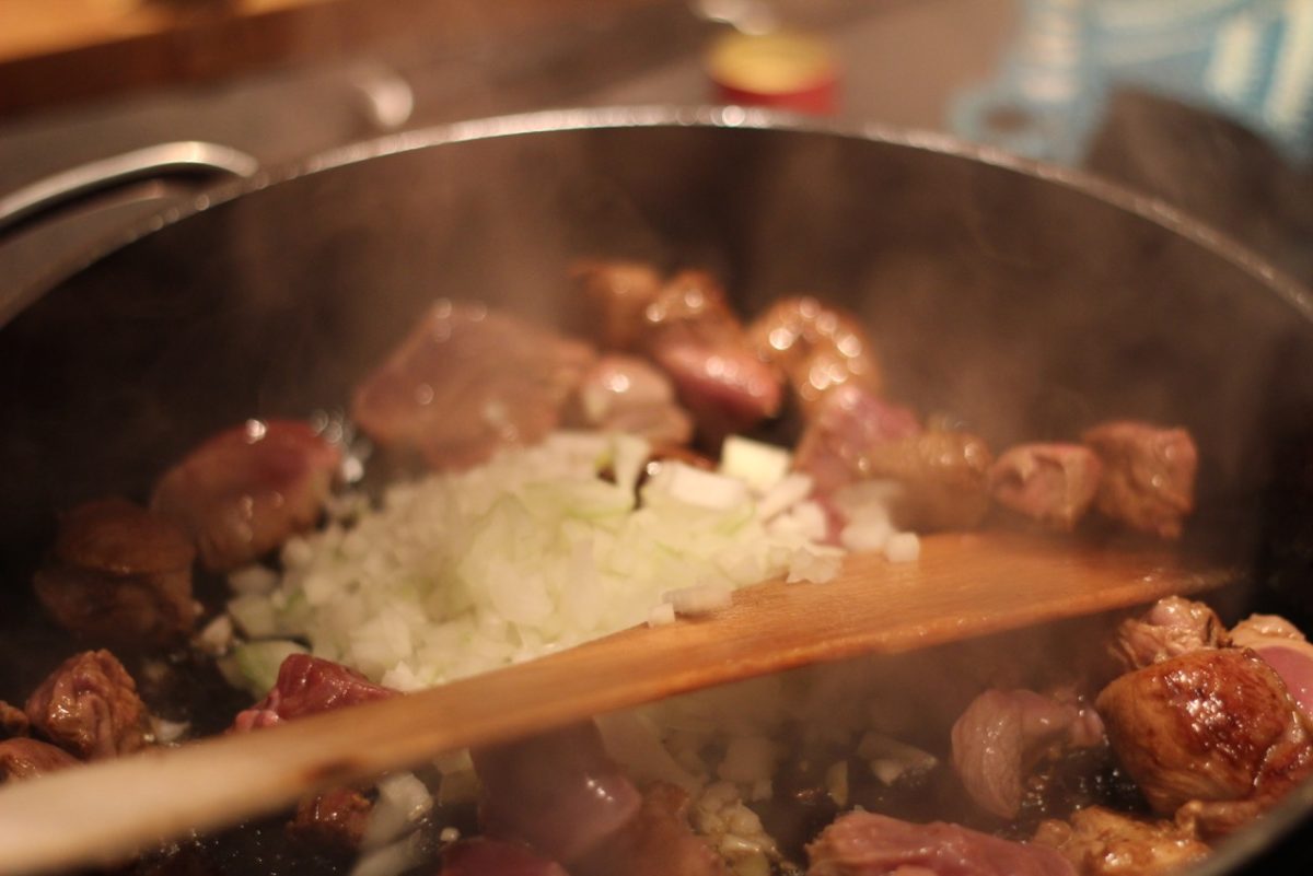 Zudecken und bei schwacher Hitze ca. 1 – 1 ½ Stunden köcheln lassen, bis das Fleisch weich ist.