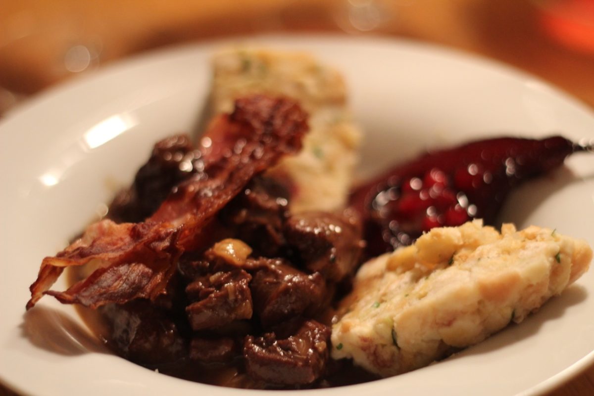 Rehragout mit Maroni, Pilzen und gebratenem Speck